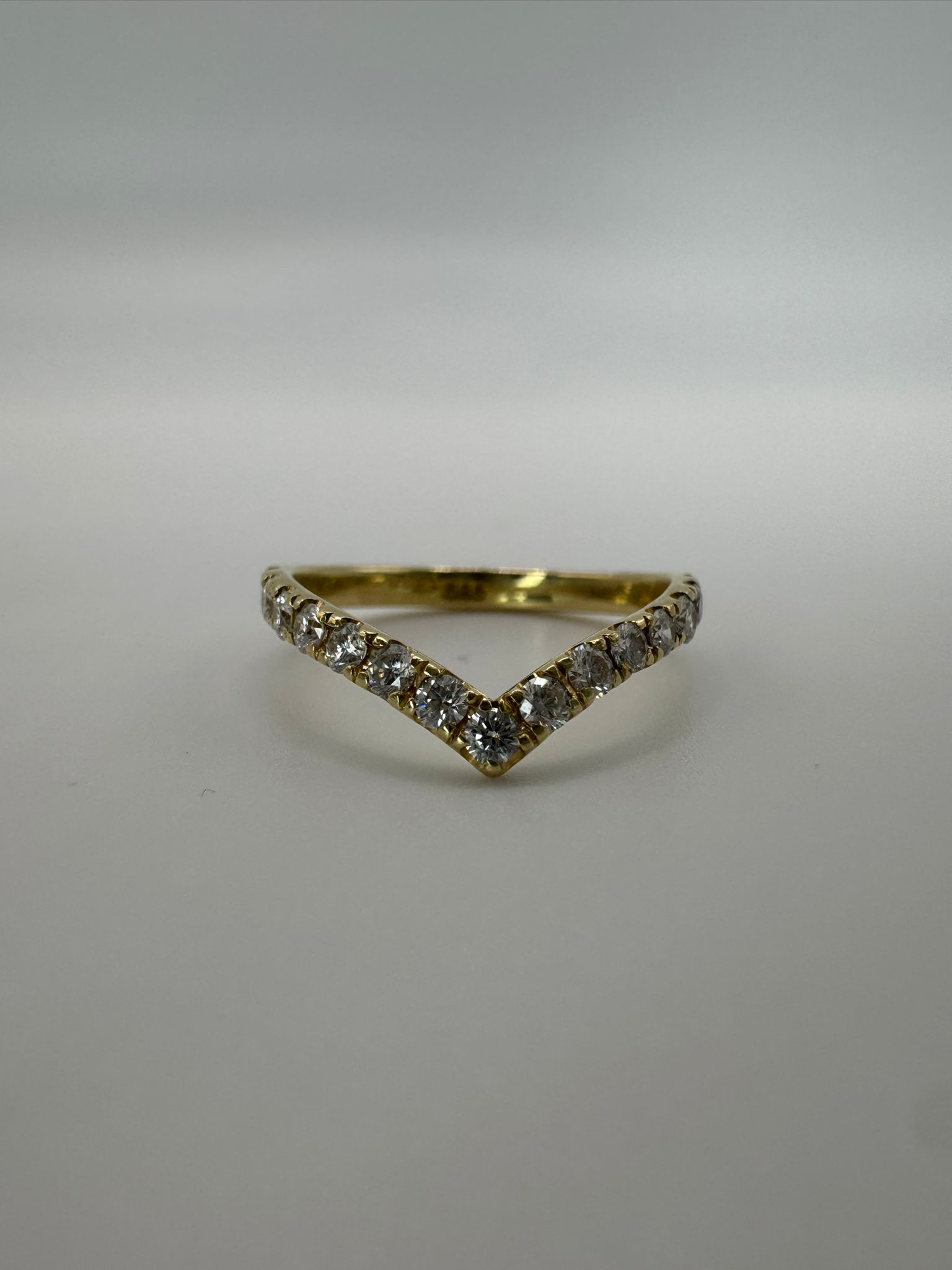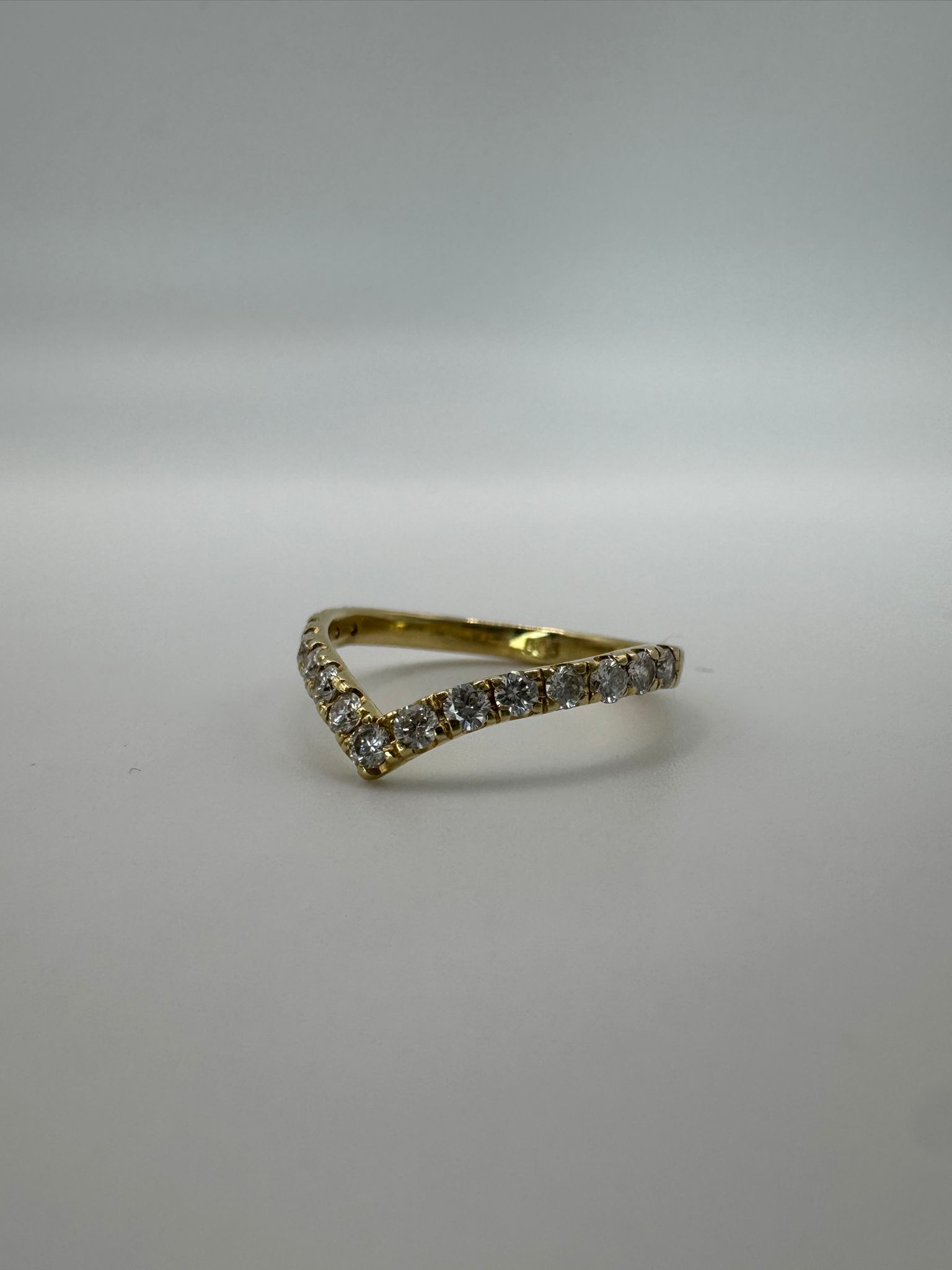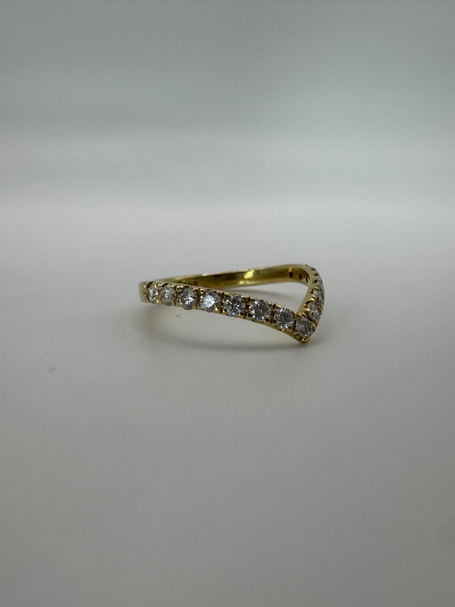 טבעת ייחודית ועדינה בעיצוב V, עשויה זהב צהוב 14K ומשובצת ב־15 יהלומים טבעיים נוצצים.