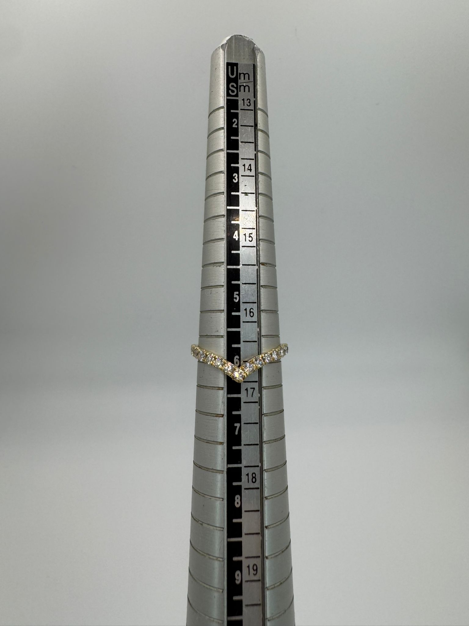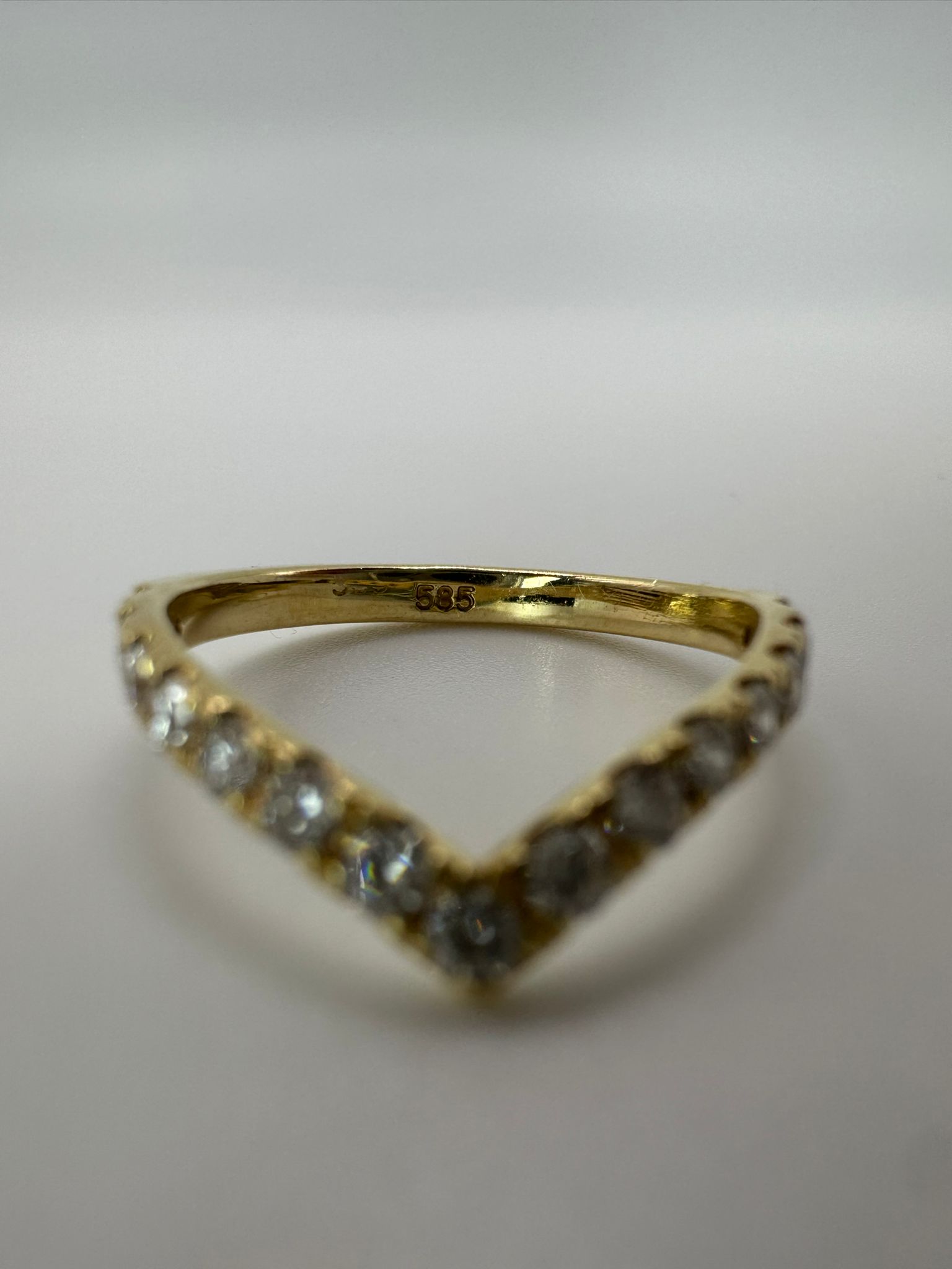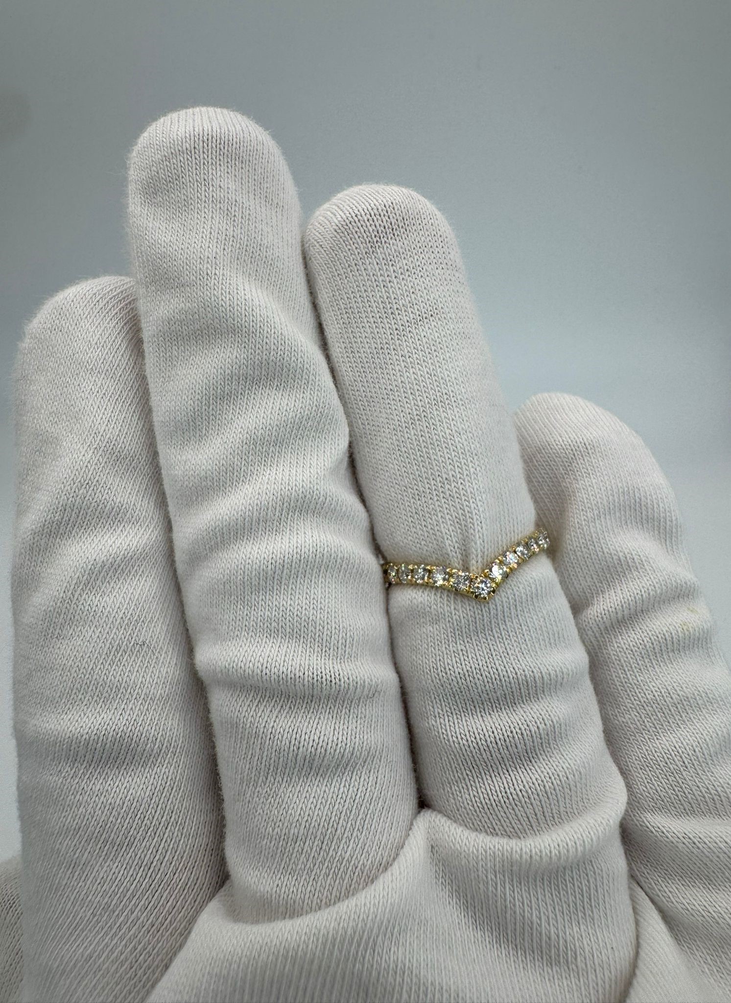 טבעת ייחודית ועדינה בעיצוב V, עשויה זהב צהוב 14K ומשובצת ב־15 יהלומים טבעיים נוצצים.