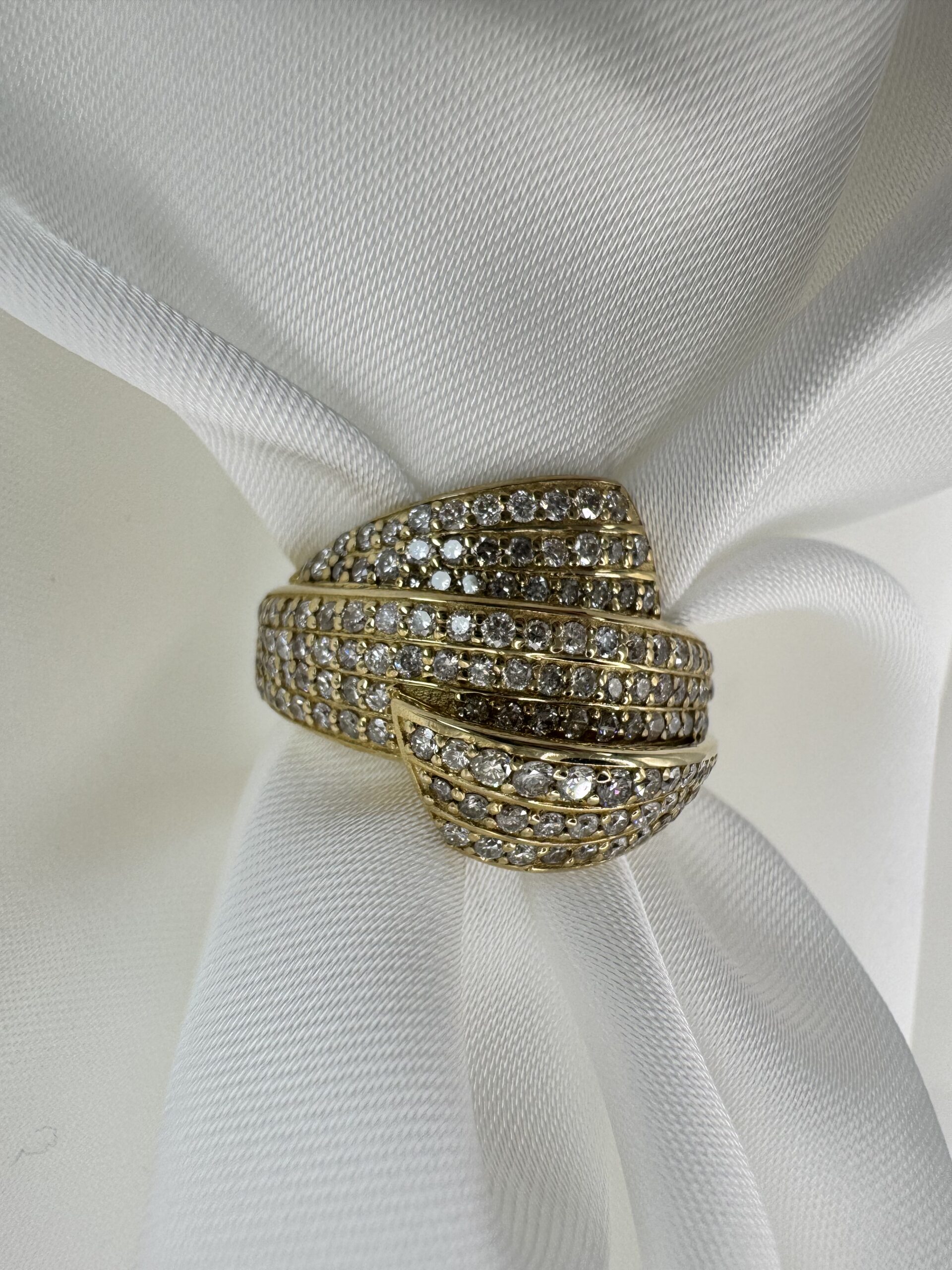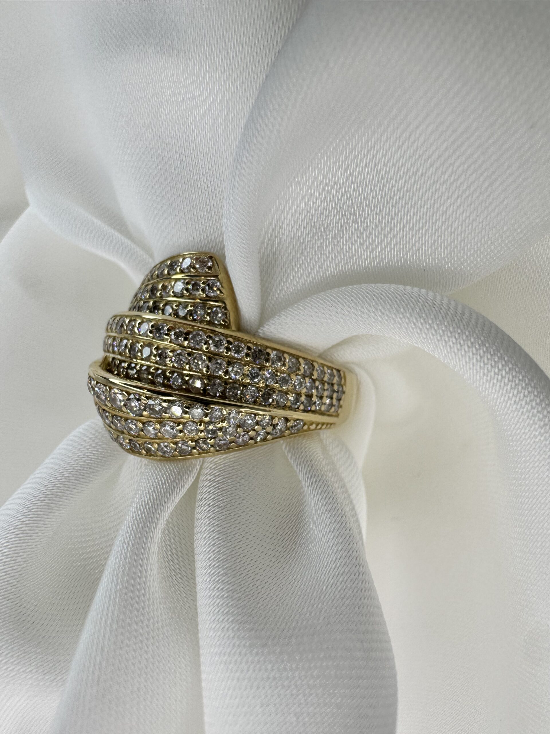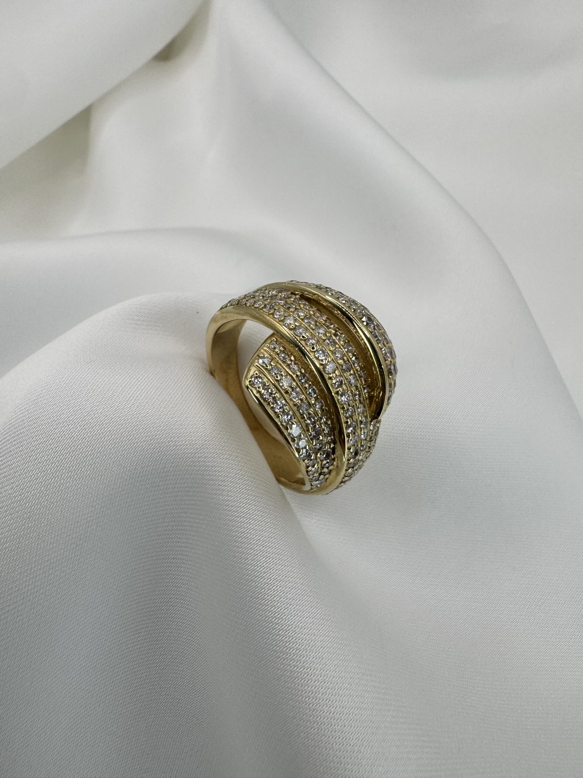 עיצוב מרהיב עם שורות יהלומים השזורות בזהב צהוב, שיוצרות מראה מלא ברק ועומק יוצאת דופן. שיבוץ צפוף של יהלומים לניצוץ מקסימלי. שילוב מושלם בין יוקרה לנועזות. טבעת שמיועדת למי שאוהבת לבלוט, להרגיש ייחודית ולהשאיר רושם בכל כניסה. מושלמת כמתנה בלתי נשכחת — או כפינוק יוקרתי לעצמך.